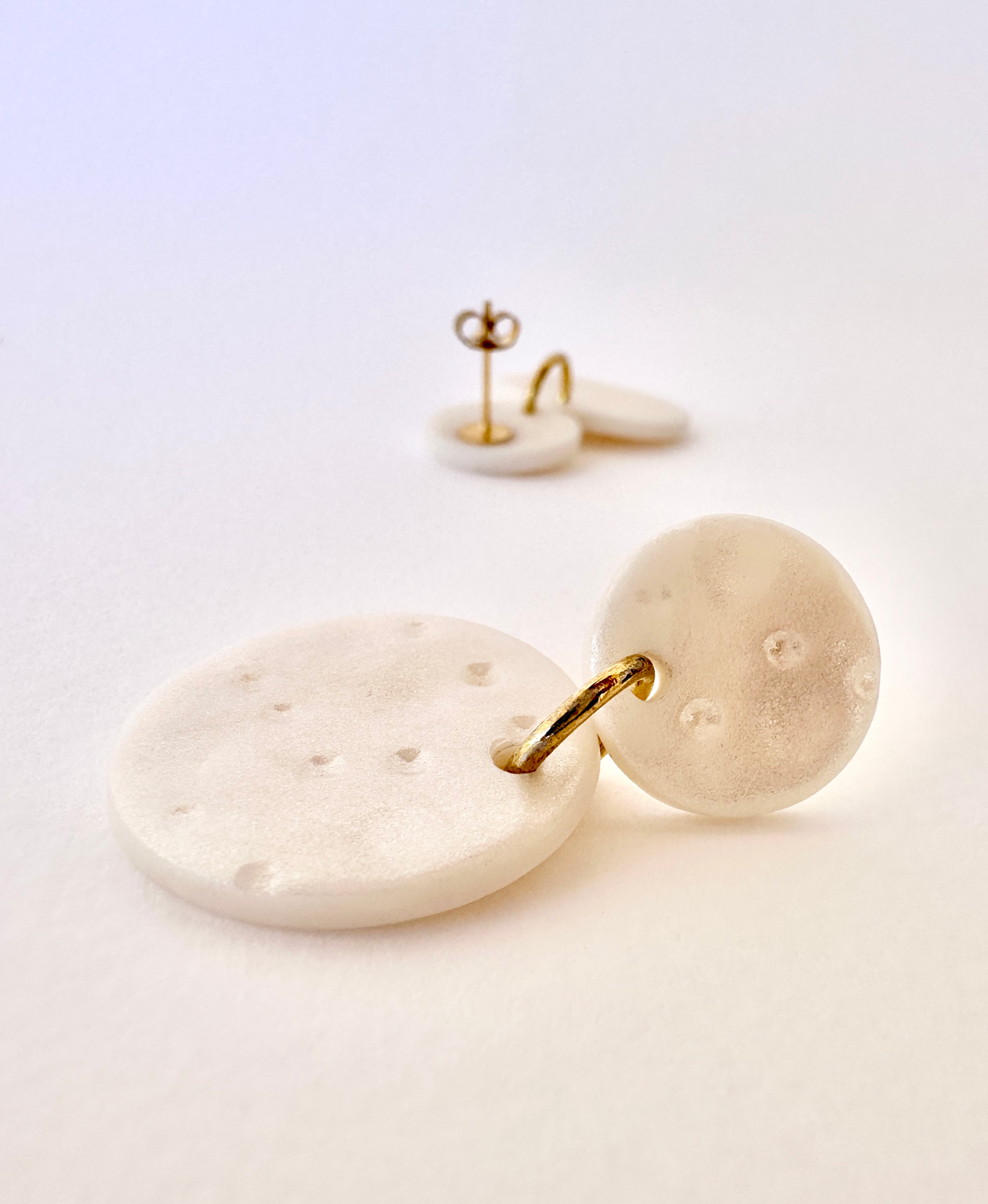 Pendientes artesanales All Night Full Moon representan la danza celestial entre la microluna y la superluna. Dos niveles de texturas nacaradas conectadas por detalles dorados, capturando la poesía de los ciclos lunares en una pieza única y elegante.