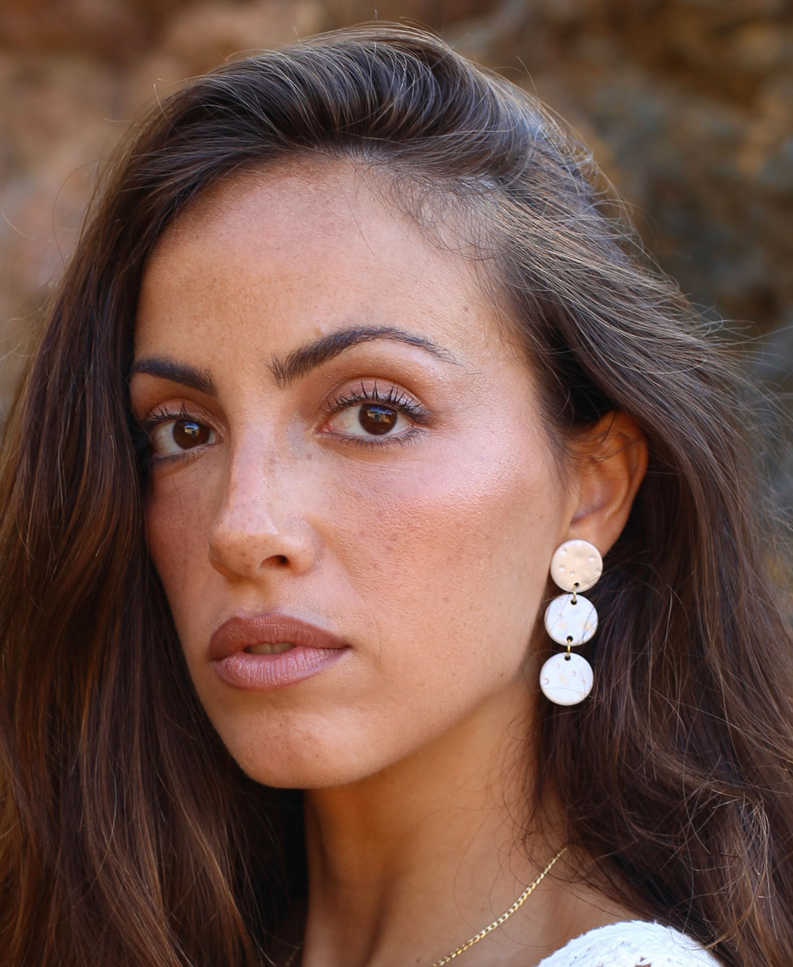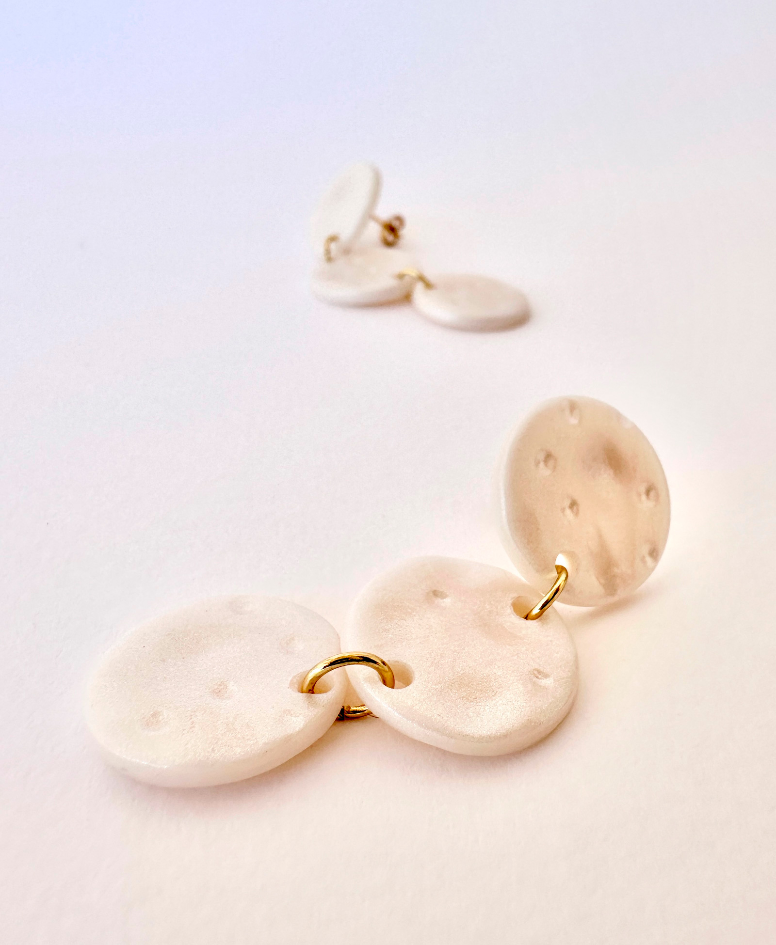 Estos pendientes surgieron del deseo de capturar la belleza etérea de la luna en una pieza que pudiera acompañarte cada día. Cada curva y cada reflejo han sido moldeados con paciencia y amor, buscando recrear esa sensación de paz y misterio que solo la luna sabe despertar en nosotros. Perfectos para complementar tanto looks casuales como elegantes. Su color neutro nacarado combina con cualquier outfit, añadiendo un toque de sofisticación y serenidad.